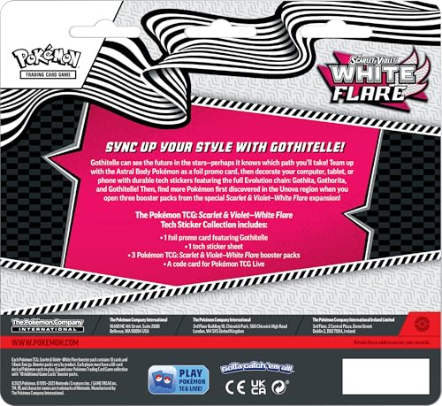 - The Pokémon TCG: Scarlet & Violet—White Flare Tech Sticker Collection includes 1 foil promo card featuring Gothitelle and 1 tech sticker sheet.